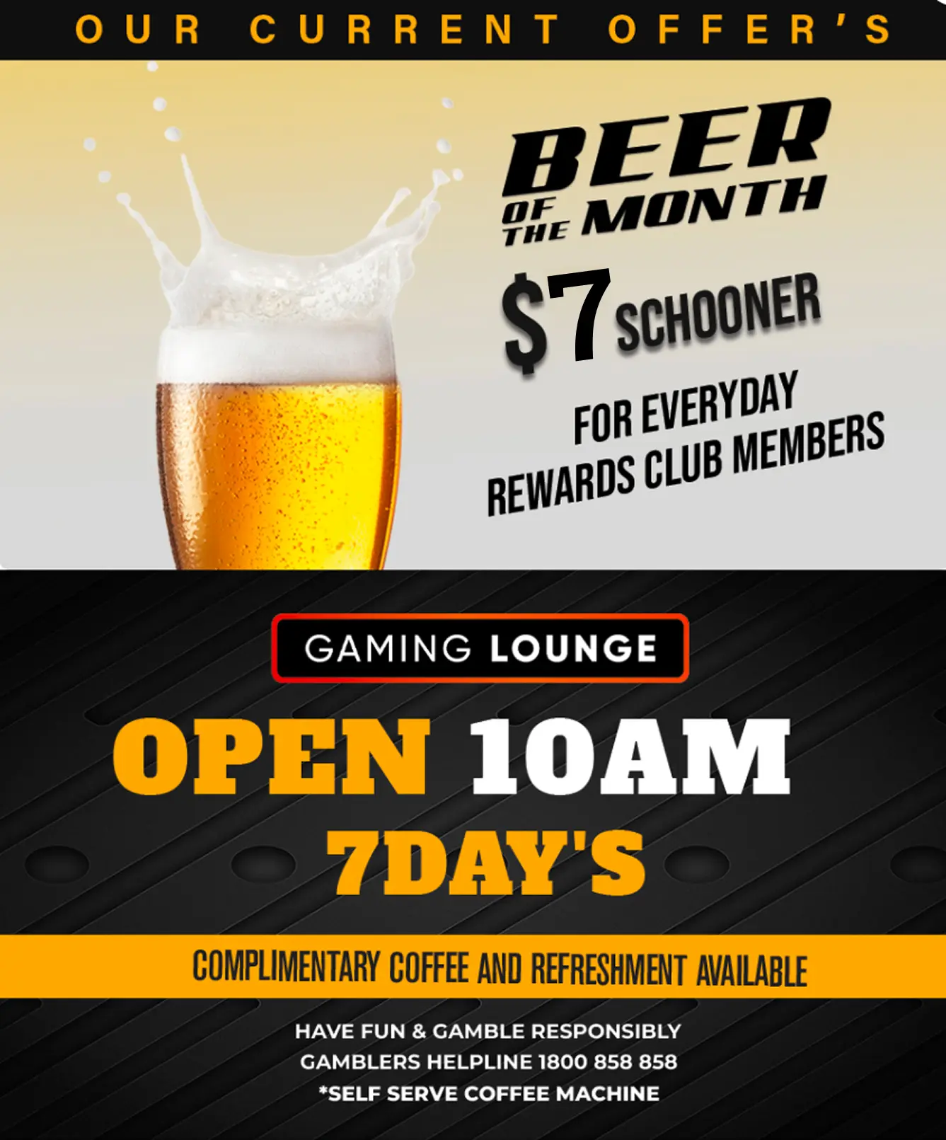 Step into the excitement of our Gaming Lounge at the Foreshore Hotel, featuring 30 poker machines in a vibrant and welcoming setting. Whether you’re a casual player or visit regularly, you can enjoy a relaxed, comfortable space with friendly service and a complimentary self-serve coffee machine. There’s also an outdoor, undercover heated smoking area for comfort year-round. We support and practise Responsible Conduct of Gambling — please play responsibly.