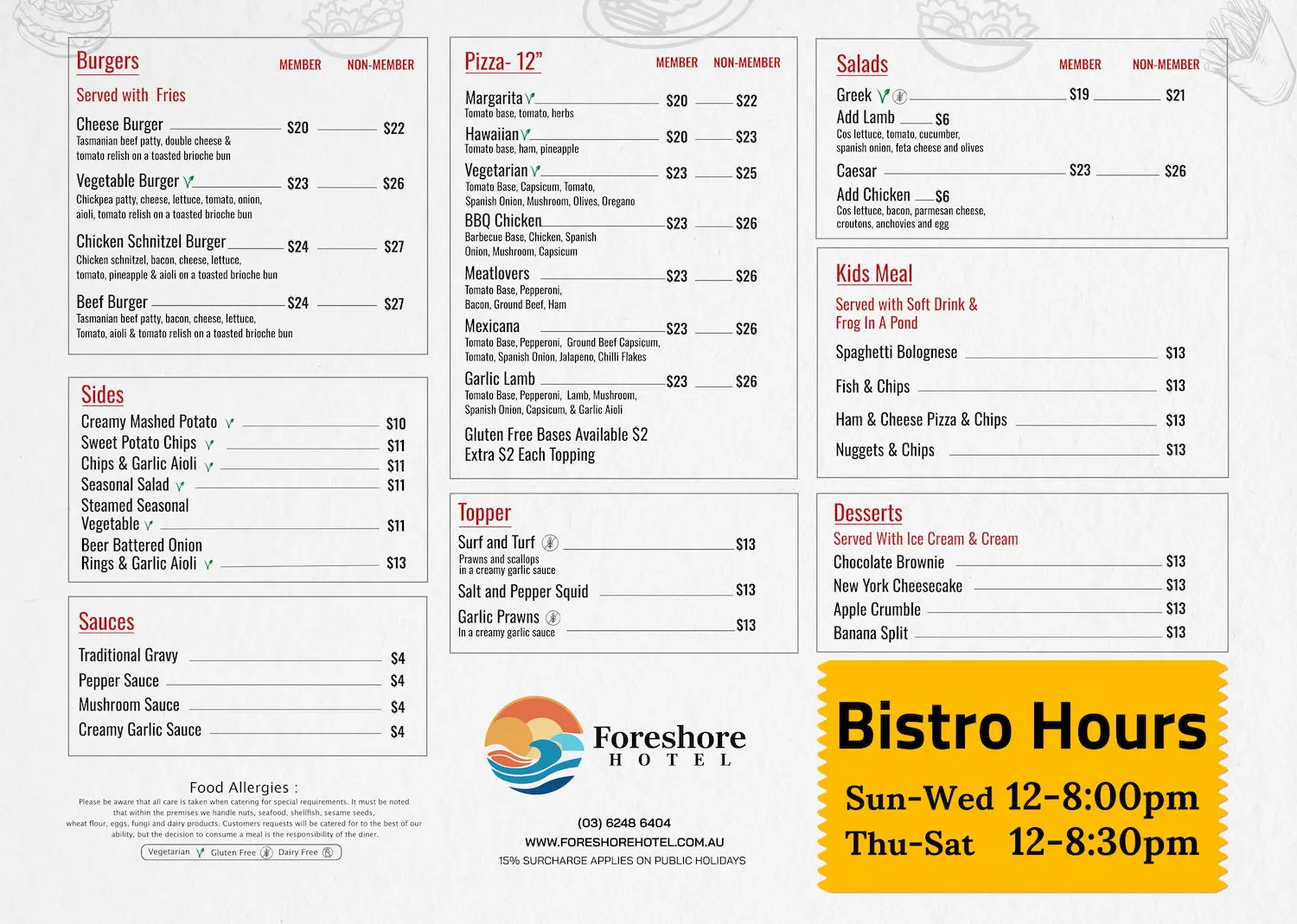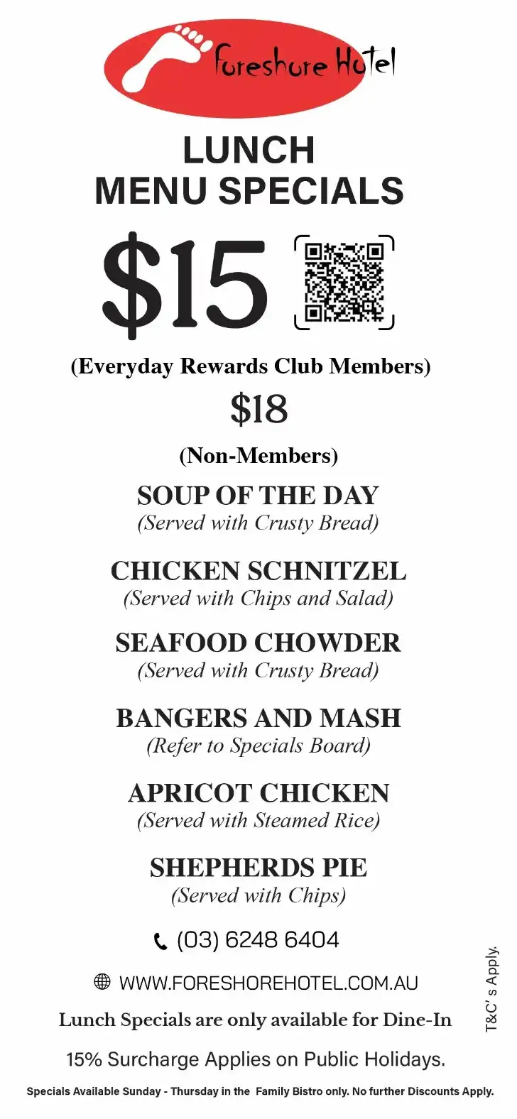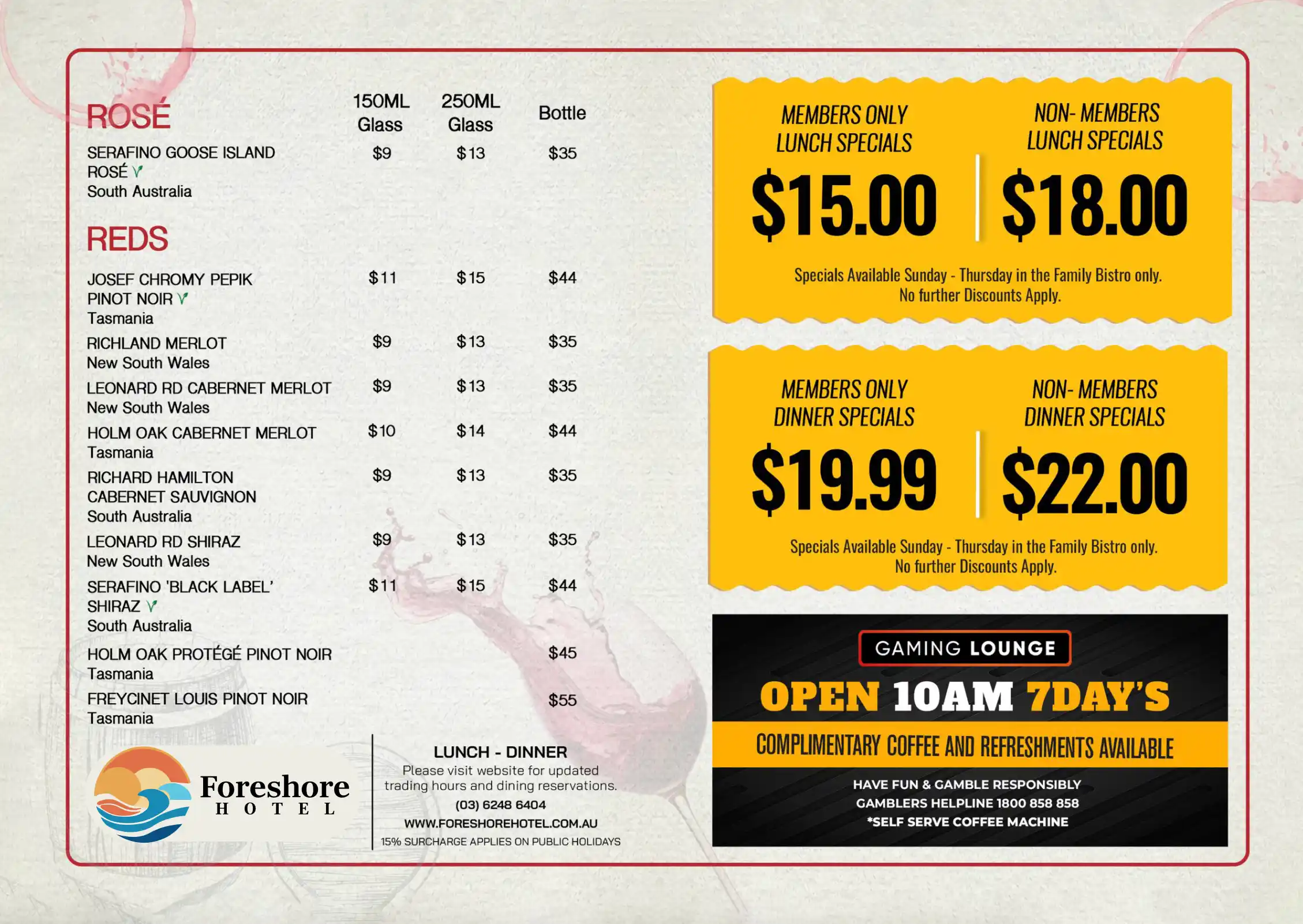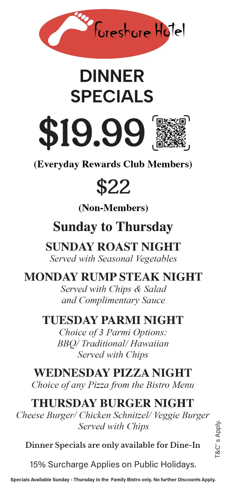 Good food, great value — that’s the idea behind our Bistro Specials, available Sunday to Thursday at the Foreshore Hotel Family Bistro.